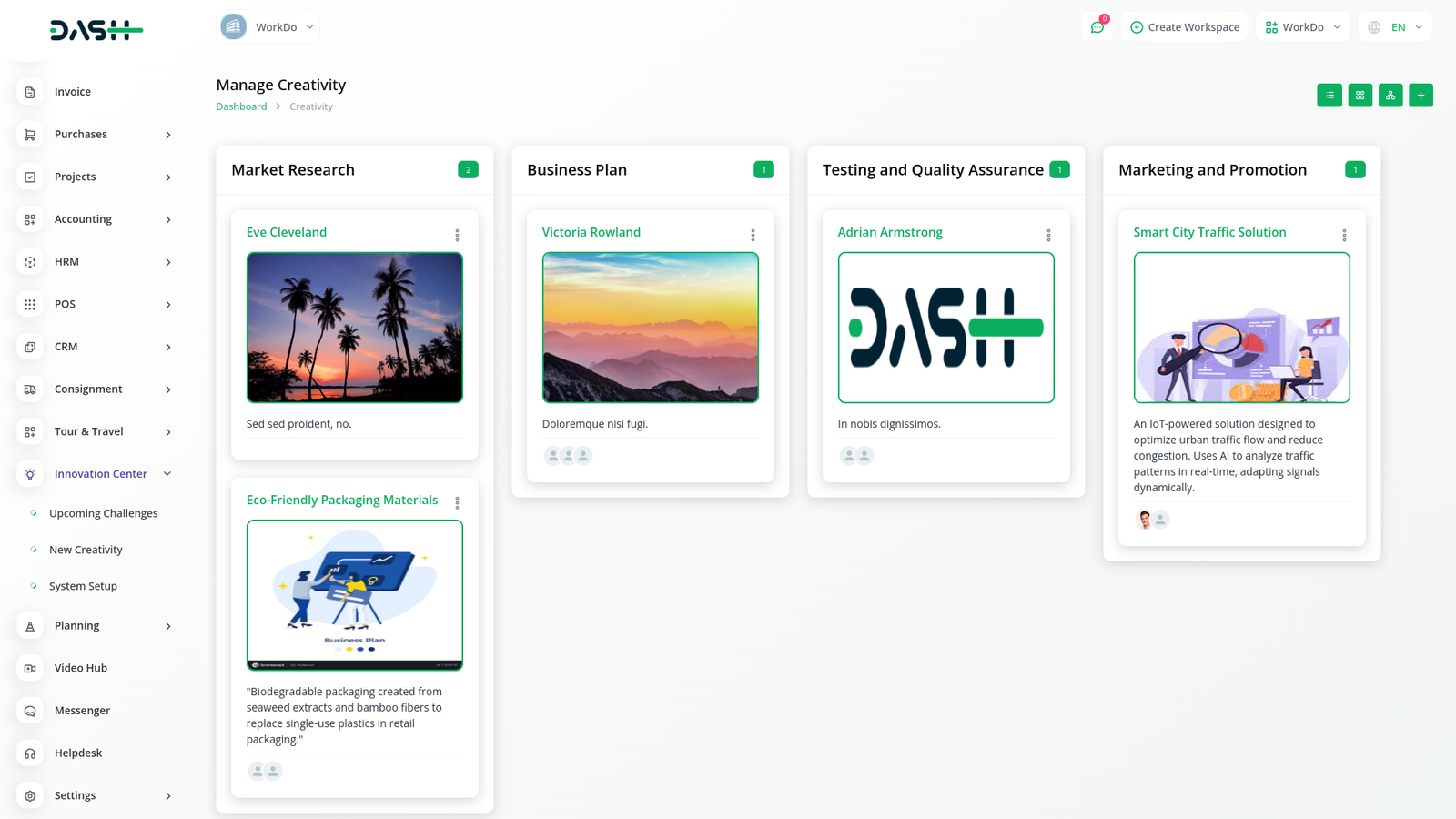 In the innovation center module, you can create ideas based on the challenge. You can provide an image, video, specify the type of users, and define the roles for those who can appreciate your creativity. Additionally, you can include multiple images and descriptions.